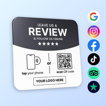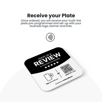Simplify how customers connect with your business. The Multi-Link NFC & QR Review Plate lets you share all your key platforms—reviews, social media, website, online shop, appointment system, and even digital business cards - directly from one stylish plaque. No more juggling separate review cards, NFC signs, or individual QR codes.